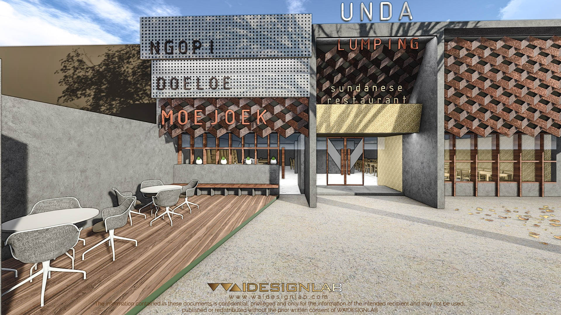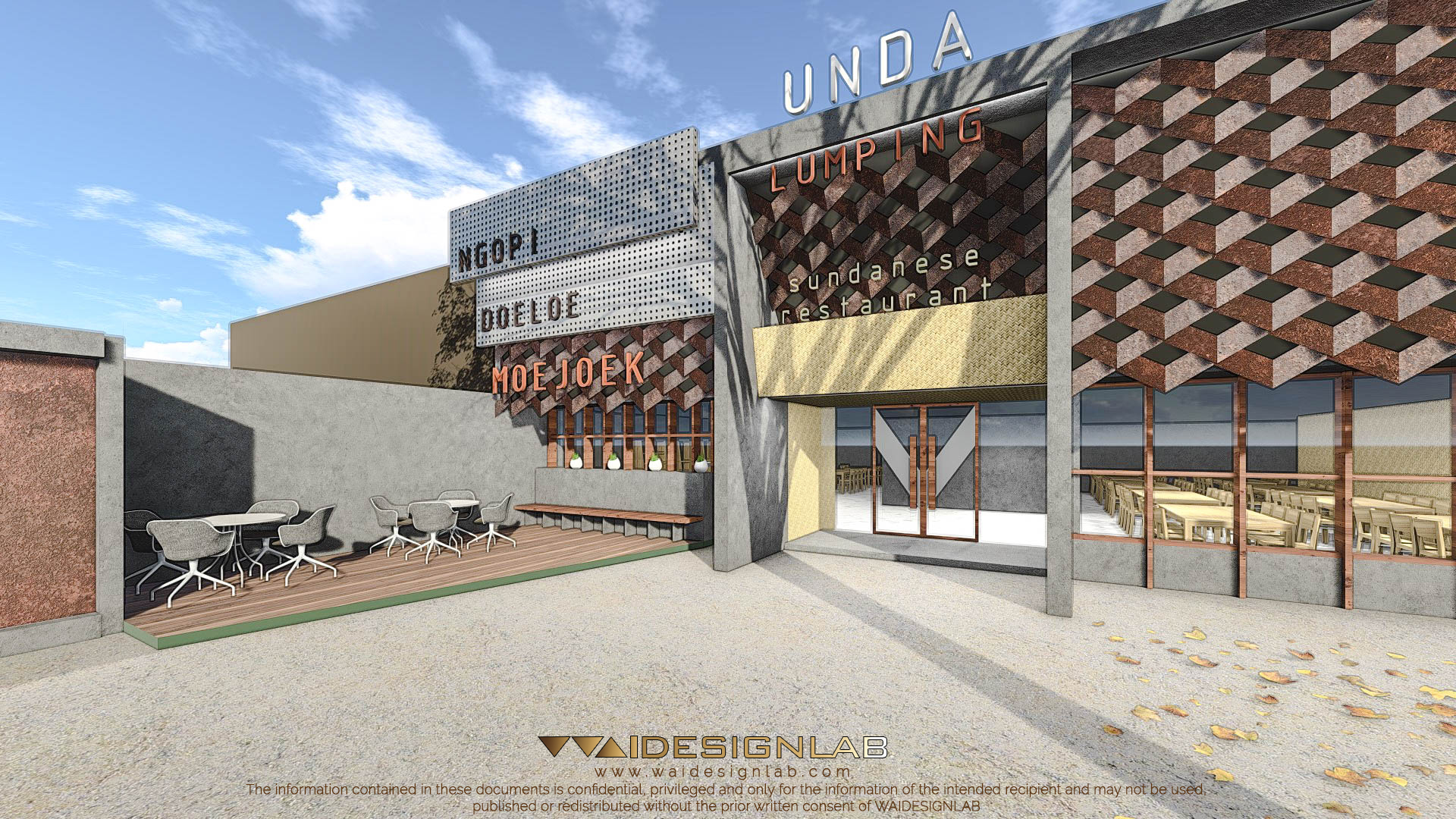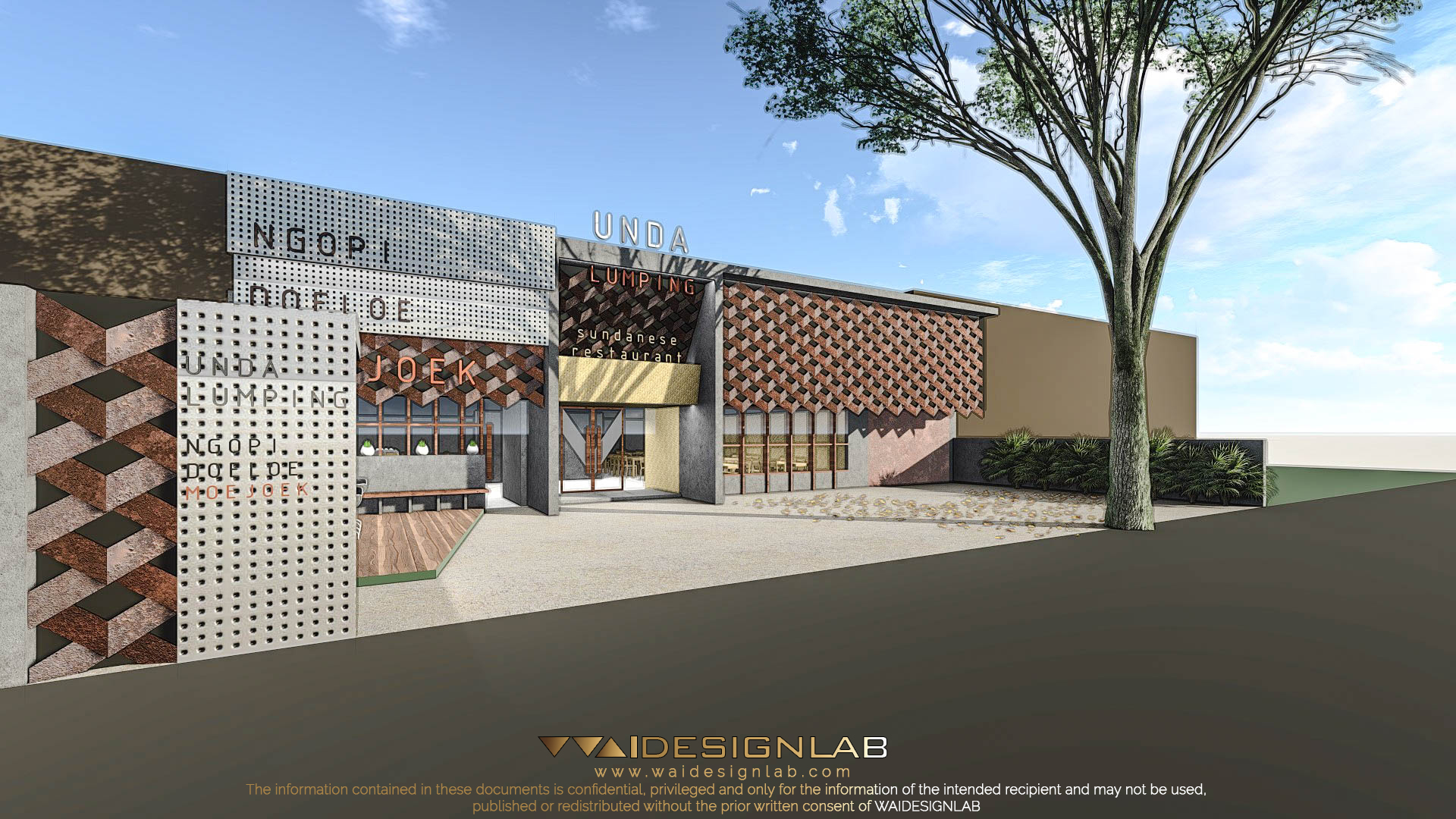 The existing building has a wide width of land with a very low height of roof, making it proportionally uninteresting from the front, therefore the designed is re-imagined with additional height using elements such as gate using material like concrete, joined with elements like bamboo weaving. Then the right part of the facade is made to imitate the shape of weaving structure, made with folded steel plate with diagonal composition.
