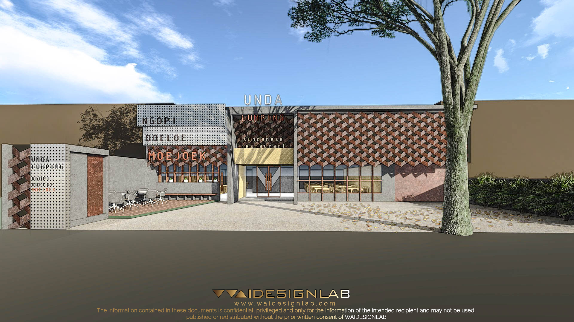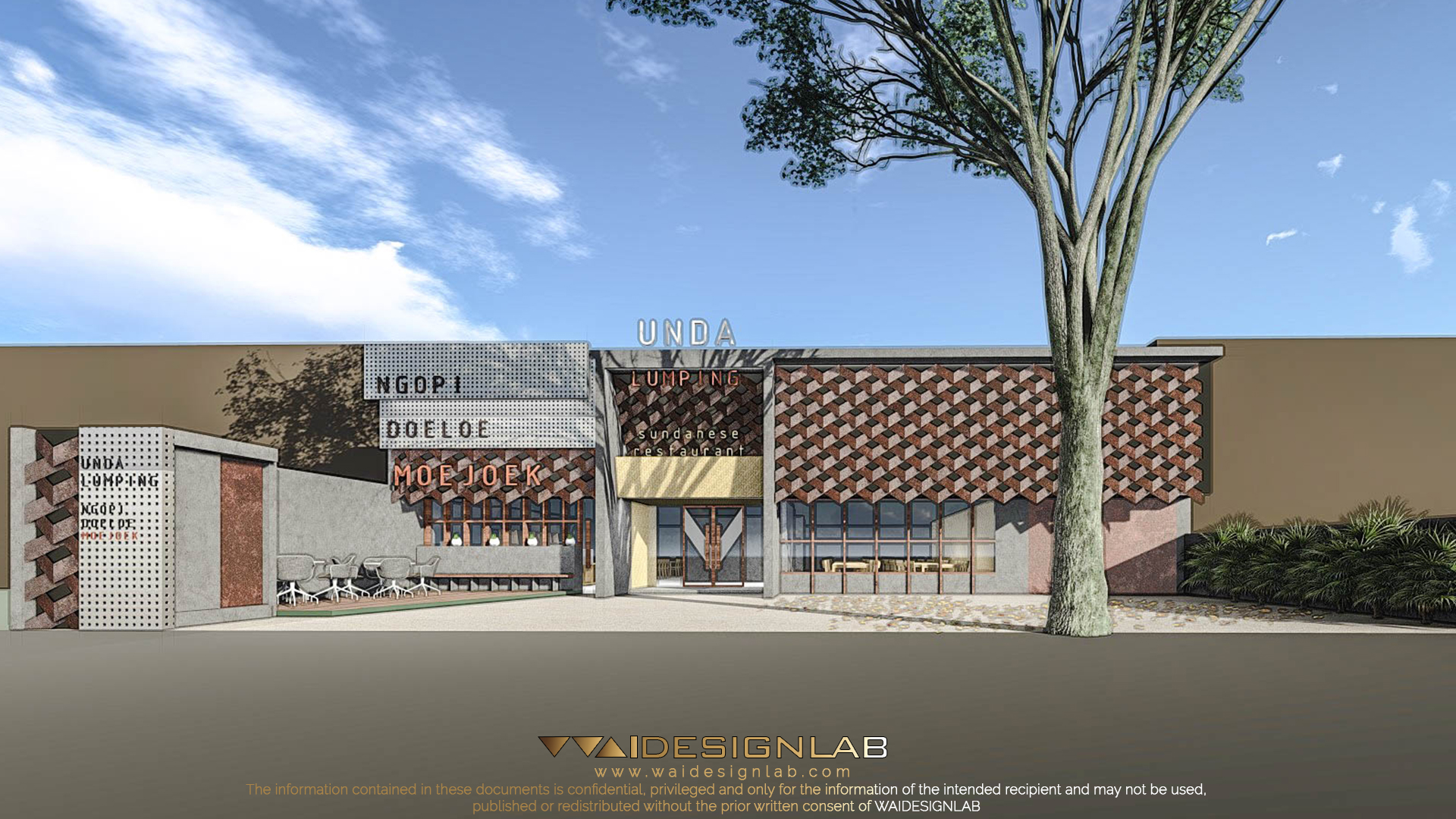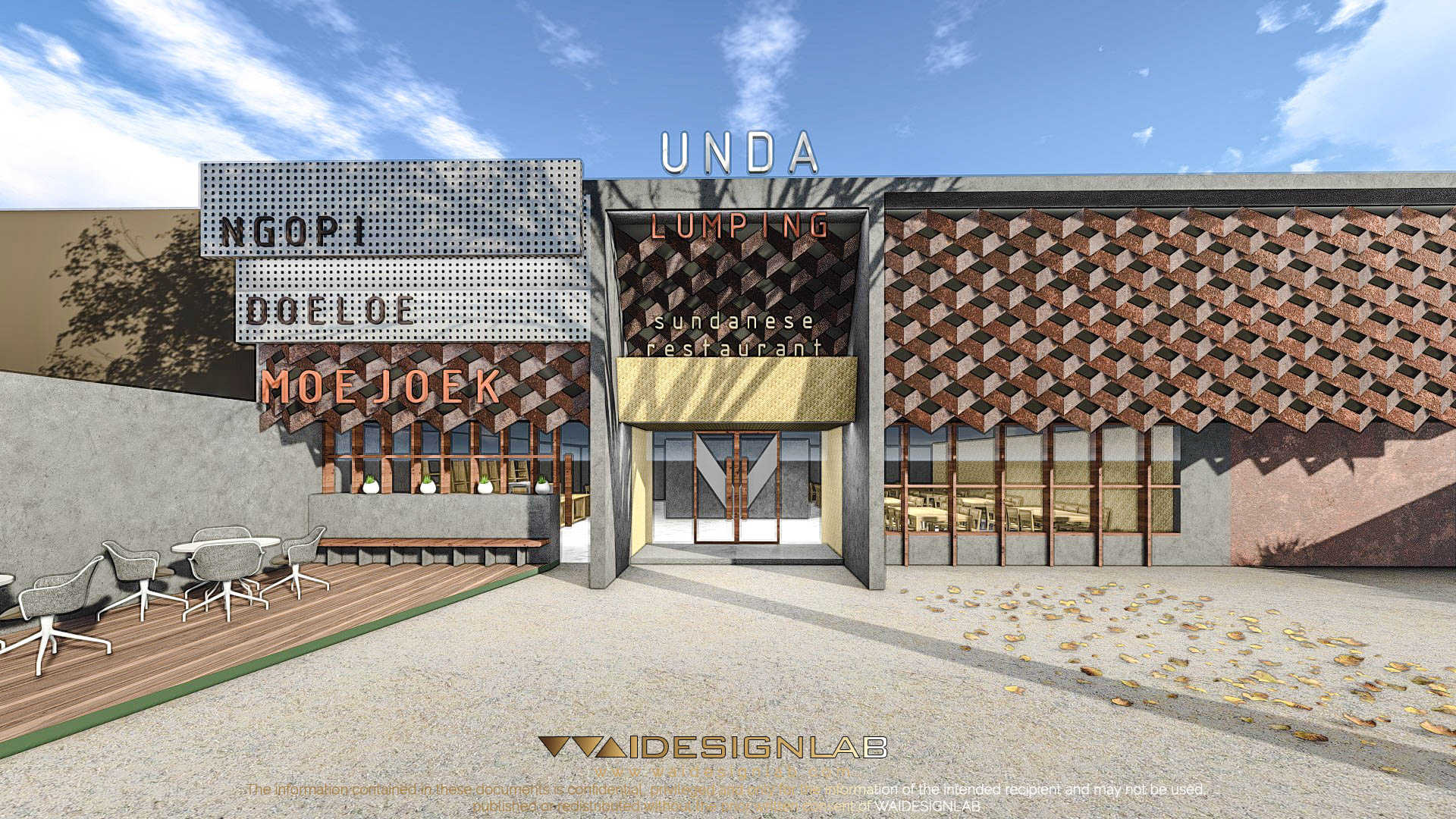 The existing building has a wide width of land with a very low height of roof, making it proportionally uninteresting from the front, therefore the designed is re-imagined with additional height using elements such as gate using material like concrete, joined with elements like bamboo weaving. Then the right part of the facade is made to imitate the shape of weaving structure, made with folded steel plate with diagonal composition.